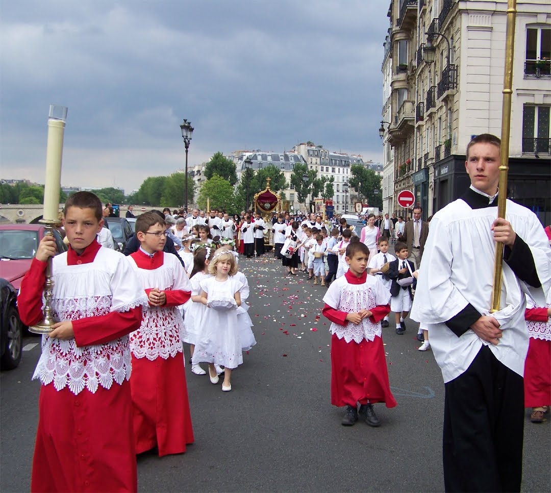 Votre (ex)père spirituel, le Vicomte Le Jollis de Villiers de Saintignon, qui voyait des mosquées partout à Roissy, a sans doute fustigé les prières de rues des infidêles et barbaresques musulmans. Et pourtant, contrairement à vous qui êtes trop jeune (quoique), il a dû connaître les « fêtes-dieu » où le curé portant ostensoir et protégé par un dais avançait sur un tapis de pétales de roses répandus par des enfants de chœur ensoutanés de rouge, avec surplis blanc, au son de saints cantiques en latin. Et honte au mécréant qui n’aurait pas décoré sa façade sur l’itinéraire de la procession. Question prière de rue, on était servi avec des autels de plein air où s’arrêtait la sainte procession dans les rues de nos villages.