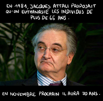 Tapez sur un moteur de recherche Attali et l’euthanasie et vous tombez sur un article de « Laissez les vivre », le site des disciples du Professeur Lejeune, anti-IVG ! Les citations sont tirées d’un livre de prospective de Michel Salomon "L'Avenir de la Vie" (Seghers, 1981). Une série d’entretiens portant sur le futur millénaire, l’après 2000. Dans le cadre de cet ouvrage, on lui pose la question : est-il souhaitable et possible de vivre cent vingt ans ? Attali, futur conseiller du prince à l’époque, se place dans « la logique même de la société industrielle » : « dès qu'on dépasse 60/65 ans, l'homme vit plus longtemps qu'il ne produit et il coûte cher à la société. »